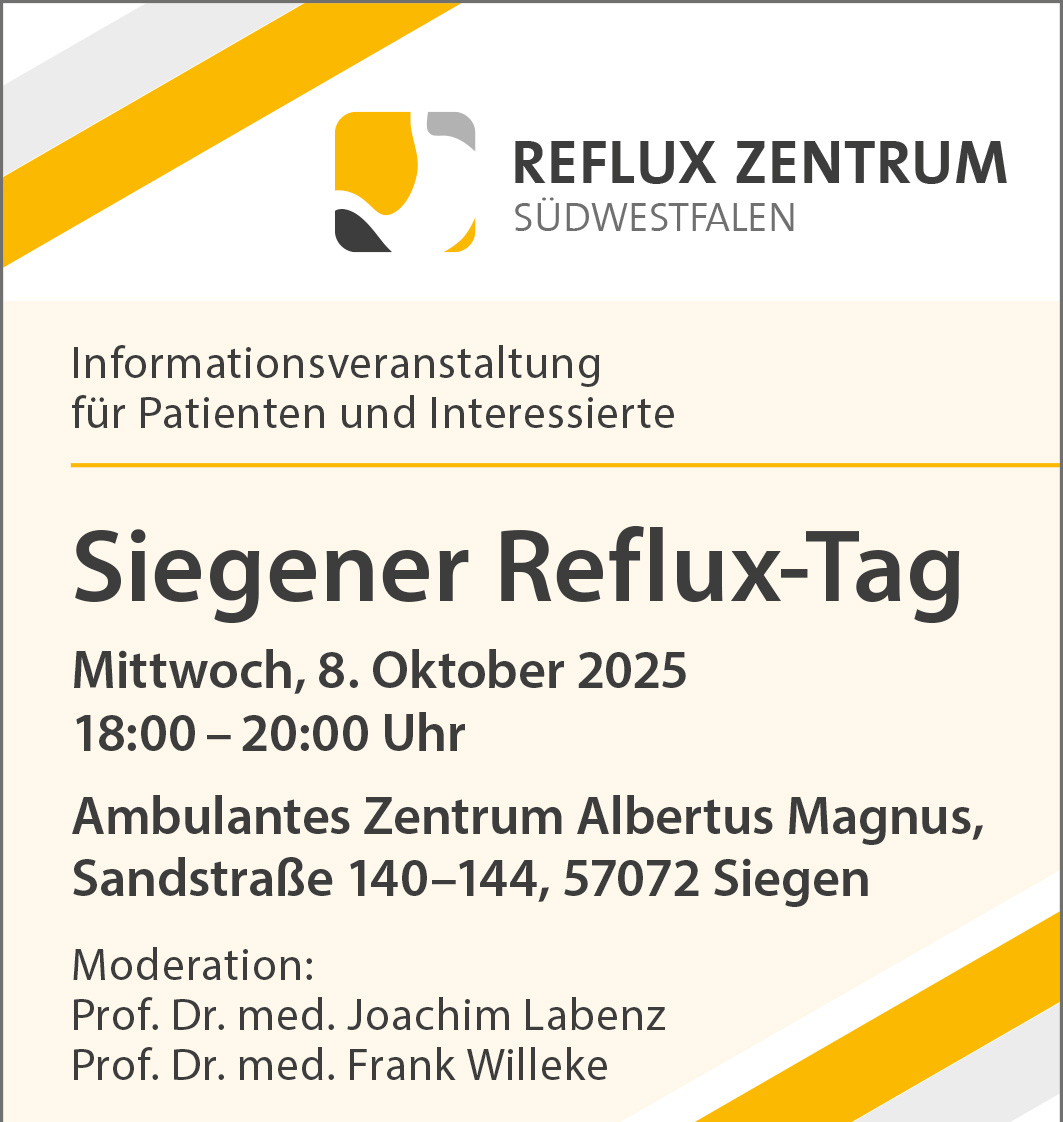 Um Betroffene und Interessierte umfassend zu informieren, lädt das Reflux-Zentrum Südwestfalen am Mittwoch, den 8. Oktober 2025, zum Siegener Refluxtag ein. Die Veranstaltung findet von 18:00 bis 20:00 Uhr im Ambulanten Zentrum Albertus Magnus (Sandstraße 140–144, 57072 Siegen) statt. Die Teilnahme ist kostenlos.